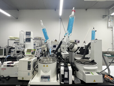 NMR、質量分析、HPLC、GC、FT-IR、ドラフトなどの先端機器を含む実験室を利用できます。オイルバスやエバポレーターもあり、有機合成や高分子合成の実験にも対応しています。