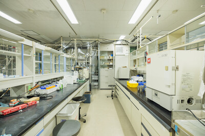 無機材料合成、材料評価が行えるラボ。ドラフトや焼成炉、GC、分光装置、質量分析装置などを完備しています。