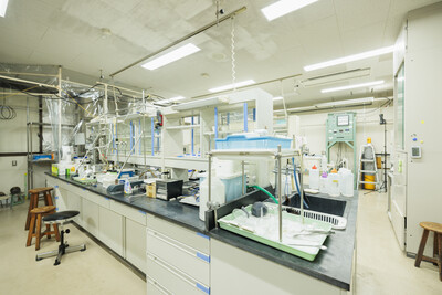 無機材料合成、材料評価が行えるラボ。ドラフトや焼成炉、GC、分光装置、質量分析装置などを完備しています。