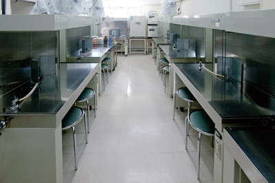 低分子の合成から細胞での活性評価が可能な実験室。化学分析のHPLCや分光光度計や、生化学分析のプレートリーダーなど分析機器も充実。医薬品の候補化合物のスクリーニングや最適化、化粧品や健康食品の細胞評価が可能です。