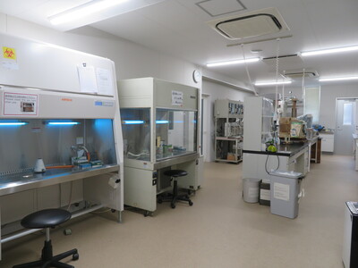 BSL2実験室が利用でき、細胞破砕装置・ホモジナイザー 、PCR、 落射式蛍光読取装置 、電気泳動装置 、等電点電気泳動装置などがそろっています。