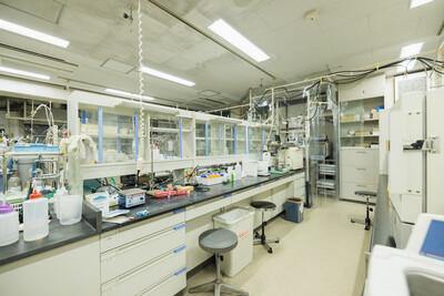 無機材料合成、材料評価が行えるラボ。ドラフトや焼成炉、GC、分光装置、質量分析装置などを完備しています。
